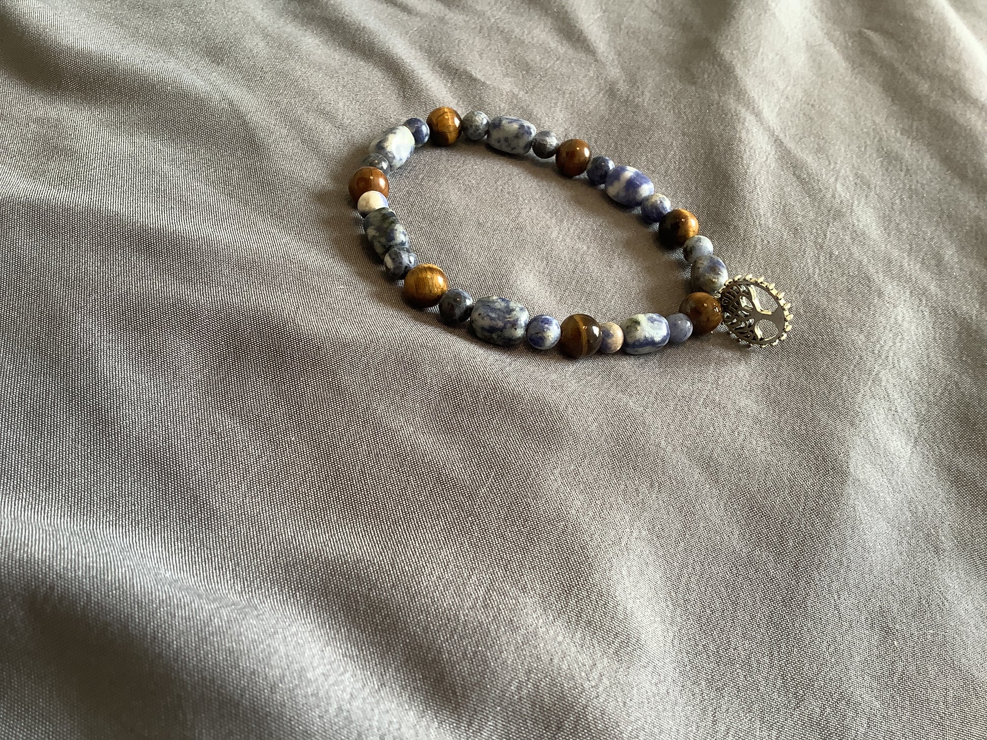 - Gemstones: Tiger’s Eye & Blue-and-White Stone Beads